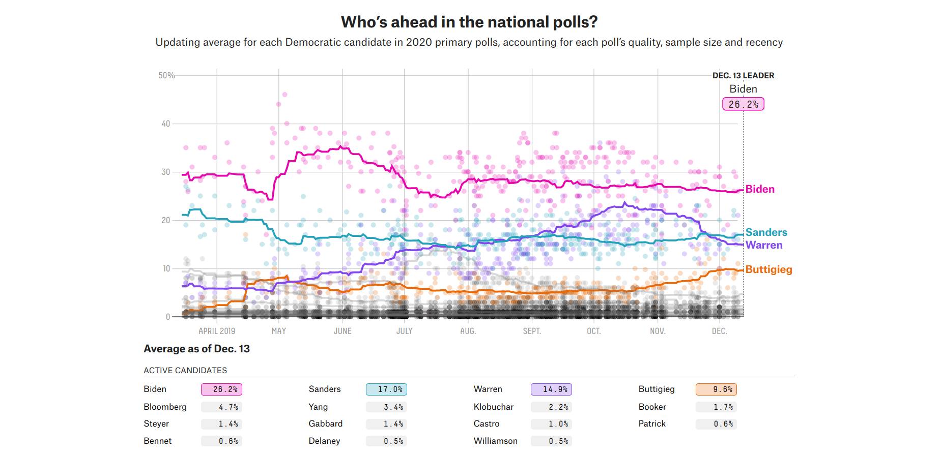 Grafiken ovan är från FiveThirtyEights sprillans nya funktion som ger oss ett genomsnitt av opnionsundersökningar. Nationella undersökningar visar fortfarande Joe Biden i topp, men det börjar bli dags att hålla mer koll på New Hampshire och Iowa nu. Där ser Biden svagare ut.