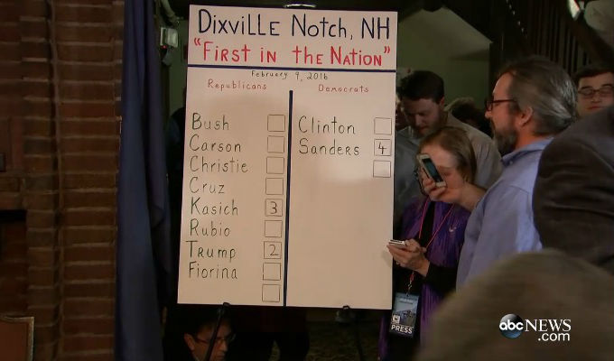 I lilla Dixville Notch, New Hampshire röstade 9 personer. Av tradition är det en av några få ställen som röstar strax efter midnatt lokal tid på valdagen. Just Dixville har gjort så sedan 1960.