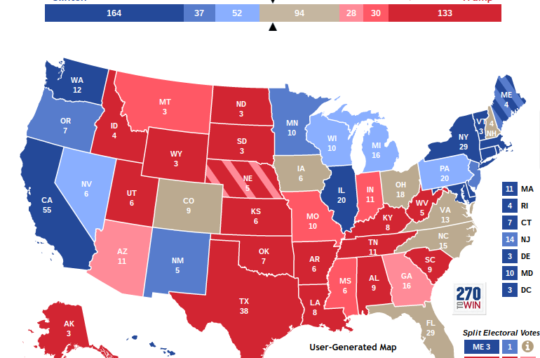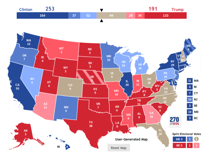 Diverse kända statistiker som analyserar opinionsundersökningar inför presidentvalet ingår i denna ”konsensuskarta” som 270towin har sammanställt. Den är något daterad vilket gör att t ex Clintons framgångar i opinionsmätningar i Florida inte riktigt registrerats än. Clintons utgångsläge idag är alltså ännu bättre än vad denna redan fördelaktiga karta indikerar. Det krävs 270 elektorsröster för att vinna valet.