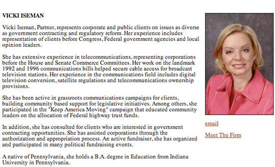 Här är lobbyisten Vicki Iseman som NY Times påstår haft ett förhållande med John McCain. Bilden och beskrivningen är hämtad från hennes företags hemsida, lobbyföretaget Alcalde Fay. Allt om henne på hemsidan plockades bort för några timmar sedan under torsdagsmorgonen. Nedan kan du se en skärmdump av beskrivningen som plockades bort.