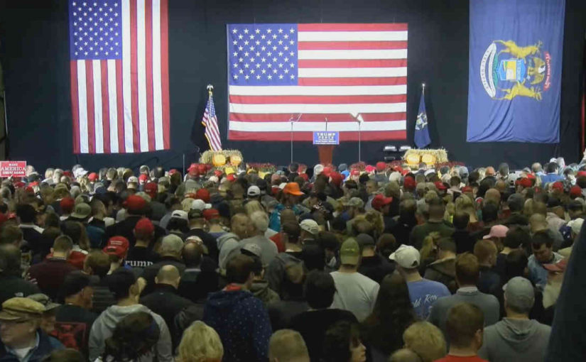 Vilken minut som helst inleder Donald Trump sitt kampanjevent i DeltaPlex Arena i Grand Rapids, Michigan. Så här ser publiken ut inför det. Jag räknar till ett tiotal kvinnor i detta foto av flera hundra Trumpanhängare. På sittplatserna bakom pressläktaren är det något högre andel kvinnor i publiken som inte syns i detta foto, men ändå i klar minoritet. Det är en inte helt ovanlig könsfördelning för ett Trumpevent.