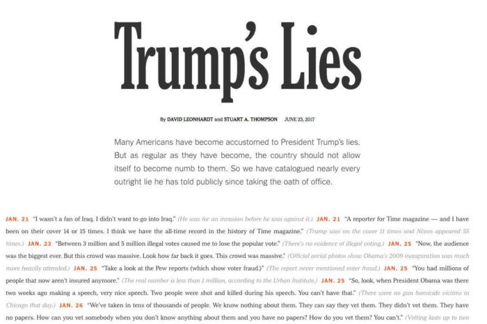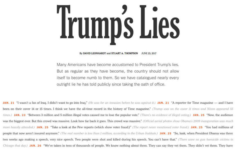 New York Times har sammanställt en lista på Donald Trumps lögner, för varje dag sedan han tillträdde som president i Vita Huset. Det blev en lång lista.