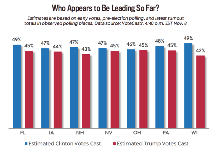 Ta det här med en stor nypa salt, men VoteCastr som vi berättade om tidigare under tisdagen visar Clinton i ledning i en rad viktiga delstater.